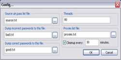 На первом рисунке программа не запущена, поэтому все показатели равны 0. Теперь подробнее о них: Threads в дословном переводе это нити, в нашем же случае количество потоков, alive - количество активных потоков. В принципе эти показания нам не столь важны. Passwords remains - в данной строке содержится информация о оставшихся номерах и паролях. Грубо говоря сколько вам еще осталось подбирать паролей. bad - тут наверно понятно, это количество паролей, которые не подошли. Нас интересует показатель good. Если он изменился, значит в файл good.txt или если вы введёте другой в настройках программы будут сохраняться ICQ номера к которым подошел пароль. К скольким номерам подошел пароль, такой и будет показатель у good. Также необходимо следить за списком Proxies. Чтоы они у вас всегда были рабочие и желательно быстрые. Общее количество проксей в вашем списке отображается в параметре Proxies. good как ни странно это хорошие прокси. alive - живые Speed - скорость в PPS. Понять её можно так: количество паролей, перебираемых за 1 секунду. Естественно чем быстрее у вас соединение с интернетом и чем быстрее прокси в вашем прокси листе тем больше будет скорость. Еще хочу обратить внимание тех, у кого стоит Windows XP Service Pack 2.Там лимит открытых соединений равен 10, поэтому скачайте этот патч. Теперь о кнопках: Start - запуск брутфорса. но для запуска нам необходимо сгенерировать uin:pass list (о нем чуть позже) и указать путь к файлу с проксями. Stop - это остановка брутфорса. Если он у вас запущен, и вам нужно выключить или перезагрузить компьютер (или еще что) то жмите кнопку stop и закрывайте IPDBrute. Config - Переход в меню небольшой настройки программы, об этом чуть позже. Cleanup - удаление "мертвых" проксей из списка. Не рекомендуется нажимать эту кнопку, если ваш брутфорс работает меньше часов 2-3. Ну и кнопка About показывает нам информацию об авторах программы.