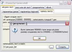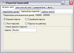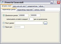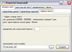 Настройки программы: Source uin;pass list file - путь файлу с ICQ номерами и паролями. Файл имеет вид: номер;пароль Далее Dump incorrect passwords to this file - имя файла, куда будут записываться все неподошедшие пароли. Dump correct passwords to this file - файл, куда будут сохраняться пароли, которые подошли. Threads - Количество потоков. Если у вас модем, то ставьте не больше 100-150, если выделенная линия или adsl (вообщем нормальный коннект) около 500 будет вполне нормально. Но чем больше потоков, тем больше будет скорость брута. Proxies list file - Путь к файлу с проксями. Чем больше их тем лучше, но запомните, их недолжно быть меньше чем количество потоков. Формат файла с проксями: IP:PORT и никаких лишних символов или пробелов после порта и пр. Cleanup every: __ minutes. - через какой интервал времени будет происходить автоматическое удаление нерабочих прокси-серверов из вашего файла. Я обычно ставлю 120-200 минут. Теперь рассмотрим программу для генерирования списков uin;pass таковых существует огромное количество, мы же возьмем программу, которую я сам использую - Powerful GeneratoR Вообще с помощью этой программы можно создавать разные списки для брута, но мы создадим uin;pass list с 1 паролем, например flowers Для этого скачиваем Powerfull GeneratoR и запускаем.
